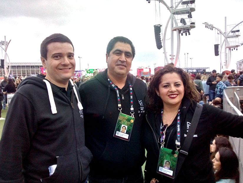 Rock in Rio, 2019, mês de setembro. Esteban Risso, diretor comercial da Gobos do Brasil, leva Oscar Tovar, diretor de suporte técnico da Martin Áudio para América Latina, e Berenice Gutierrez, diretora regional de marketing para América Latina e Caribe da mesma empresa, para conhecer as instalações do Palco Mundo.
