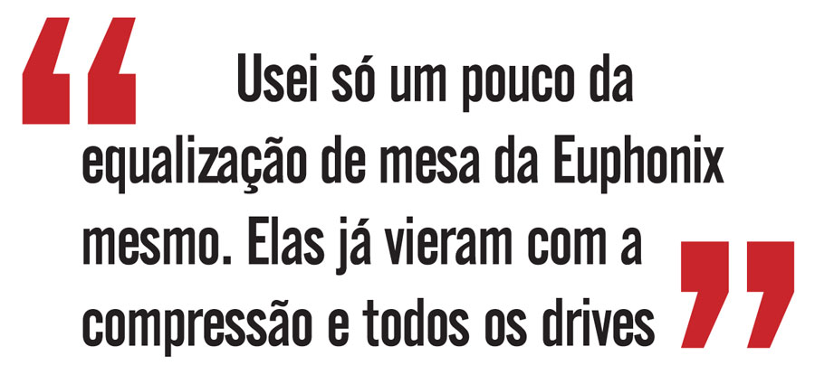 … Mixando... Mixar uma gravação ao vivo é como uma reconstrução. O som é captado, dividido em vários canais e depois levado ao estúdio para ser reconstruído de forma a passar, de forma verossímil, o que aconteceu no dia da gravação. É preciso que não se limpe demais o som. Para timbragem e ajustes, Flavio Senna lançou mão do setup habitual com o qual trabalha na Cia dos Técnicos “Na bateria usei a Lexion 300 para a caixa e o TC Electronics 2290 para os tambores”, detalha. Para baixo e bumbo, ele usou um efeito mais curto no Harmonizer H3000. Também para baixo e bumbo foi usado o compressor Universal Audio LA3A. As guitarras de Pepeu e Dadi já chegaram com os timbres prontos. “Usei só um pouco da equalização de mesa da Euphonix mesmo. Elas já vieram com a compressão e todos os drives. Em algumas, com um agudinho um pouco mais presente, usei uma equalização com um Q bem fico para ajustar”, conta o técnico de som.