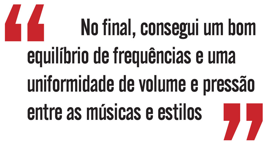 O trabalho de Carlos Freitas seguiu uma orientação geral, pensando em um som uniforme para momentos, instrumentos e vozes distintas no decorrer do show. “Antes de começarmos o trabalho de masterização, o Pepeu me disse que o projeto tinha dois estilos distintos, o acústico e o elétrico, com instrumentações diferentes como violão e guitarra, por exemplo, além de ter quatro cantores diferentes. Ele gostaria que a pressão sonora fosse bem parecida e que não houvesse diferença entre os estilos. Isso me levou a dividir o projeto em dois blocos. Na parte elétrica, eu usei os equalizadores Dangerous BAX EQ e Maselec e o compressor Dangerous. Para a parte acústica eu usei os mesmos equalizadores, mas troquei o compressor Dangerous pelo Manley. No final, consegui um bom equilíbrio de frequências e uma uniformidade de volume e pressão entre as músicas e estilos”, detalha.