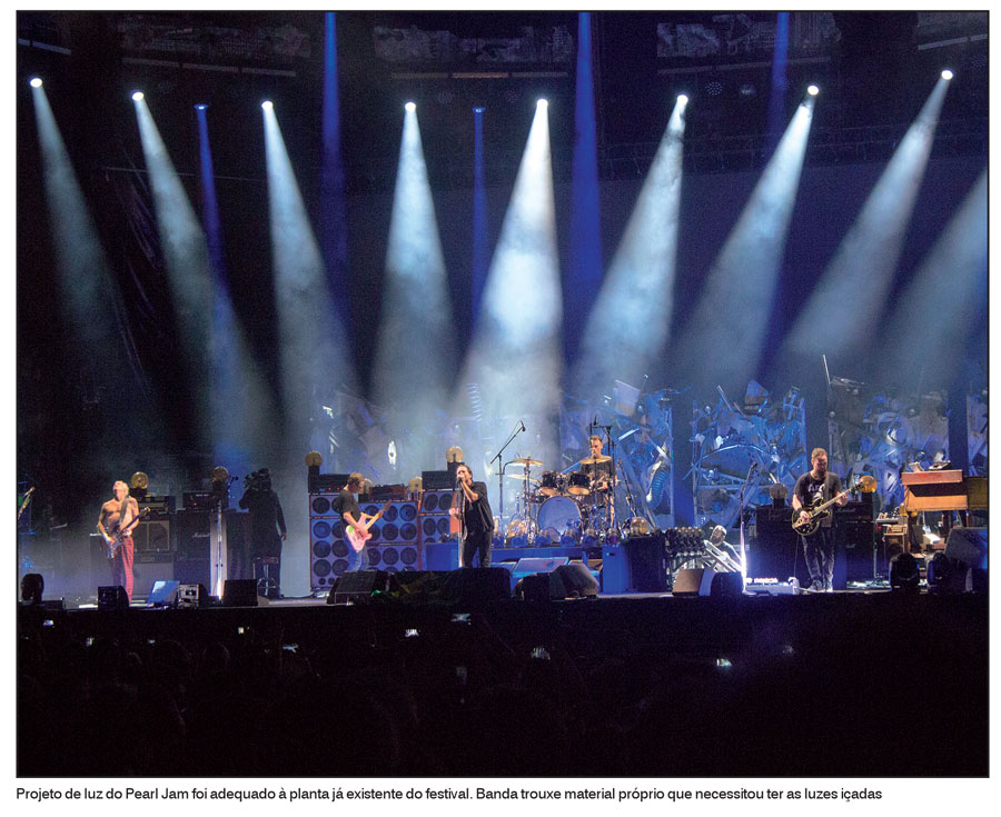 A respeito das exigências dos headlines, Marcelo destaca o desafio em adequar a planta de luz do festival com a do Pearl Jam. A banda de Seattle viajou com material próprio e necessitou içar as luzes, posicionando-as com as já existentes do mapa do festival.