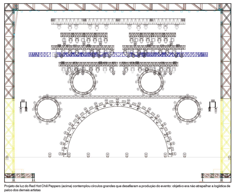 Segundo o lighting designer responsável pela compatibilização das plantas dos artistas, Michel Pinheiro, foi necessário caber todo o projeto de luz do festival no modern grid do Pearl Jam que, por conta de seu tamanho, teve que ficar livre para não atrapalhar os demais shows do palco principal. “O Red Hot Chili Peppers também precisou de adaptações para caber tudo. Destaque para os círculos grandes que ocasionaram preocupação por parte da produção geral, que não queria afetar a logística de palco de outros artistas; e a utilização exclusiva de seis canhões de frente e oito contra (que foram de lateral), colocados exclusivamente para o show”, elucida.