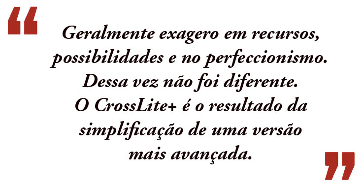 Geralmente exagero em recursos, possibilidades e no perfeccionismo. Dessa vez não foi diferente. O CrossLite+ é o resultado da simplificação de uma versão mais avançada. Tive horas de conversa com colegas para deixar o estritamente necessário ao trabalho dinâmico. Mais para frente os usuários que desejarem ir muito além em seus projetos, poderão adquirir essa versão avançada. Com certeza o início com o CrossLite+ fornecerá conhecimento técnico e capacidade de investimento financeiro necessários para a evolução.