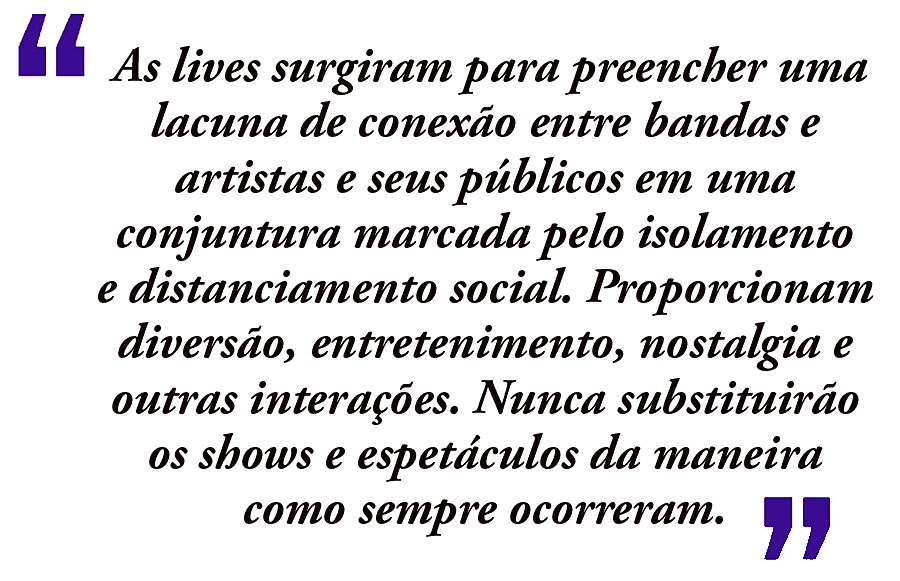 Finalmente, as lives surgiram para preencher uma lacuna de conexão entre bandas e artistas e seus públicos em uma conjuntura marcada pelo isolamento e distanciamento social. Proporcionam diversão, entretenimento, nostalgia e outras interações. Nunca substituirão os shows e espetáculos da maneira como sempre ocorreram. No entanto, podem reaproximar virtualmente esses atores em condições das atuais oportunidades e expectativas. No futuro, poderão ser outros meios de interação dentro de uma nova realidade, uma vez que aquela já conhecida, possivelmente sofrerá mudanças. Será isso mesmo?