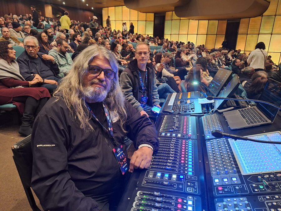 O profissional usou uma console DiGiCo SD5 como ferramenta para uma mixagem com muito critério e bom gosto. Murillo evitou usar efeitos, já que o espaço apresenta bastante ressonância. Com elogios à fidelidade sonora da mesa, Correa disse ter dado uma segurada no volume do P.A.: “O som já vinha muito forte do palco. Se eu aumentasse mais para abafar isso, ficaria muito volume, e essa não era a ideia. O desafio de um espetáculo assim é manter o equilíbrio. Coloquei as vozes em um lugar adequado na mixagem, respeitando o som que já vinha forte do palco”, completa o engenheiro de som, que usou microfones Neumann, Shure, AKG e DPA.