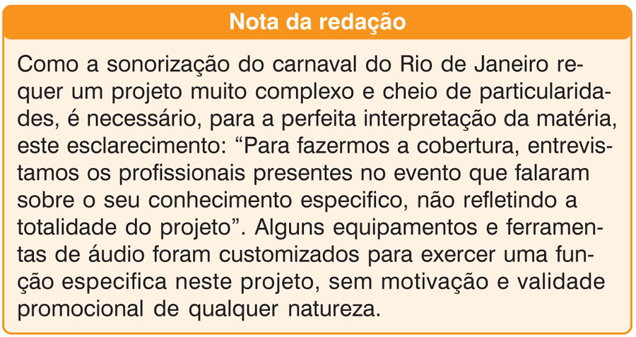 “Usamos praticamente todo o mesmo sistema de anos anteriores, mas com algumas pequenas mudanças: na Praça da Apoteose usávamos Vertec e agora estamos usando Norton LS8. Isso também na Presidente Vargas e nos recuos. De resto, o sistema continua igual, com o mesmo sistema por RF e fibra como backup, caixas L Acoustic K1 para arquibancadas, K2 para a pista e Kara para as frisas.