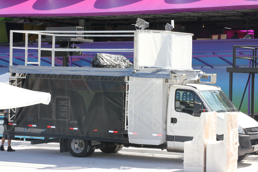 “O sinal sai do caminhão e chega aqui. Sai dos microfones e chega direto aqui pelo sistema sem fio. Temos um sistema de captação com 20 antenas espalhadas na avenida para captar tudo sem fio.