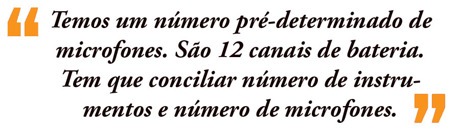 “Nós temos um número pré-determinado de microfones. São 12 canais de bateria. Tem que conciliar número de instrumentos e número de microfones. Tem os de ambiente e a captação das peças como repique, tamborim, chocalho, cuica... E aí dimensionamos para poder aparecer tudo nas caixas de som.