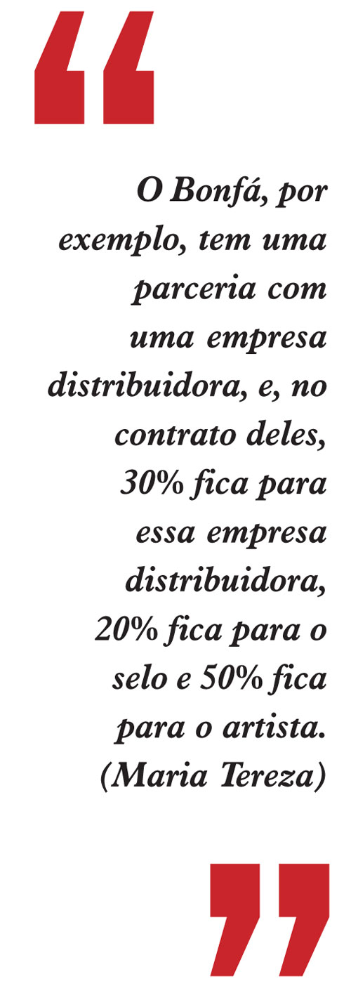 A cantora pernambucana Maria Tereza, que lançou recentemente por streaming seu primeiro álbum Folhas em Mim, pela Bonfá Estúdio, vê com entusiasmo essa nova forma de distribuição e divulgação dos trabalhos dos artistas. “O Bonfá, por exemplo, tem uma parceria com uma empresa distribuidora, e, no contrato deles, 30% fica para essa empresa distribuidora, 20% fica para o selo e 50% fica para o artista. Dessa forma, o artista não precisa ter vínculo de editar a música, não passo por gravadora, então quem quiser utilizar uma faixa, o contato é direto com o artista, o que para mim é muito bom, diferente de outras formas de distribuir. O Folhas em Mim, entrou mundialmente em todas as plataformas, incluindo as operadoras de celular, o que já estava no contrato. Nos três primeiros dias, por exemplo, o Spotify mostra a quantidade de acessos que tive no mês, foram 168 audições. Tenho um amigo que tem a possibilidade de saber onde minha música está sendo ouvida fora do Brasil (porque o Bonfá terceiriza essa informação, então não tenho acesso aos números no Brasil), e soube que meu disco lá fora estava sendo escutado mais no México, Bogotá e Chile”, ressalta.