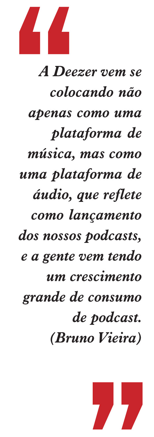 “A Deezer vem se colocando não apenas como uma plataforma de música, mas como uma plataforma de áudio, que reflete como lançamento dos nossos podcasts, e a gente vem tendo um crescimento grande de consumo de podcast. Estamos buscando cada vez mais parceiros e um trabalho para aumentar a produção, tanto quanto de conteúdo original, quanto de artistas, com gravação de entrevista, e gravação de pocket, então é um grande passo que estamos dando”, comenta.