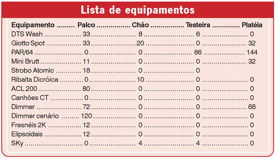 No projeto da iluminação, uma mistura intensa com cenário e vídeo. A luz foi desenhada com base no primeiro plano da boca de cena. A luz de palco complementa os sistemas de Led, com grids em formato de arco, como a boca de cena, ajudando a direcionar o olhar do espectador para os painéis de Led com imagens do fundo do palco, ressaltando a idéia de profundidade.
