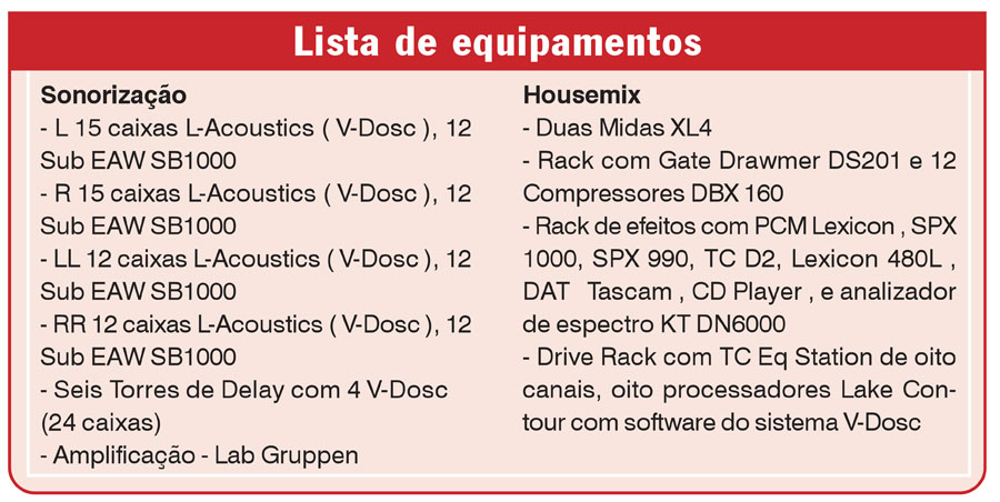 A configuração final do equipamento ficou da seguinte forma: foram colocados dois “cinturões” de caixas V-Dosc paralelos em cada lado do palco. O “cinturão” interno foi montado com 15 caixas e o externo com 12. Cada um deles tinha 12 caixas de subgraves EAW SB1000 embaixo. As seis torres de delay com quatro caixas V-Dosc cada uma foram distribuídas por 240 graus no Maracanã, junto ao fosso que divide o campo com a antiga geral, alternadas com colunas de três caixas de line array da Norton. Para a fila do gargarejo, até 10 metros do palco, foram colocadas um total de 18 caixas DV-Dosc tanto entre os P.As LL e RR como em frente da área de boca de cena, cobrindo em até 10 metros a frente do palco. Na housemix, duas Midas XL4, uma para Ivete e banda e outra para convidados, ficaram à disposição de Kalunga, que usou um rack de efeitos com Lexicon PCM90 e 480L, Yamaha SPX 1000, SPX 990 e um analisador de espectro Klark Technik DN6000. Kalunga gosta de um equipamento específico para tirar a sibilância em 6000 Hz, característica de Ivete Sangalo: um compressor multibanda BBS. Ele ainda trouxe um TC Helicon para usar na voz da cantora.