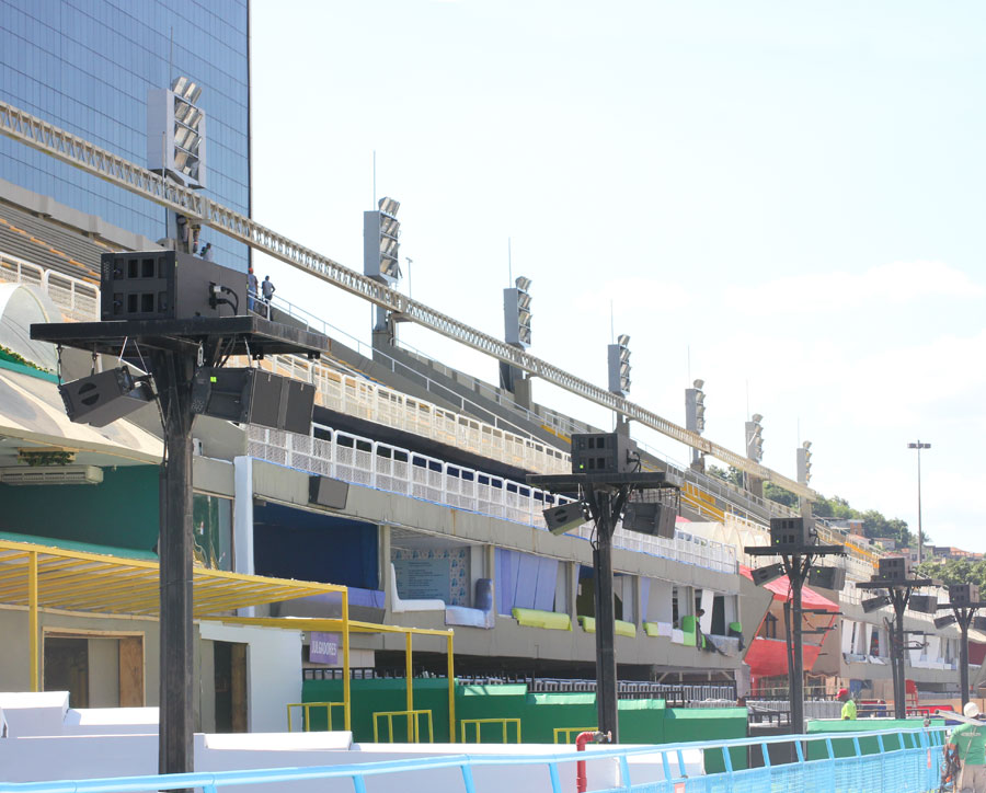 A complexidade aumenta com a dinâmica operacional do evento: assim que uma escola encerra seu desfile, a seguinte inicia praticamente sem intervalo, com pouco tempo disponível para qualquer reconfiguração de captação ou processamento.