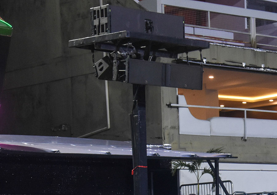 Este ano houve também mudança na sonorização das frisas. “Antes os setores 10 e 11 recebiam ARCS-Wide, agora tem as Kara [com as frisas] ficando uniformes com todos os outros setores”. Outra mudança foi no primeiro recuo de bateria. “Foi montada uma ponte retrátil sobre a avenida, a qual ocupou um espaço significativo do recuo, espremendo a formação das Baterias, forçando com que ela ficasse mais longa e esguia, necessitando o acréscimo de caixas ali para atender à nova dimensão dos conjuntos de ritmistas”, detalha Racy.